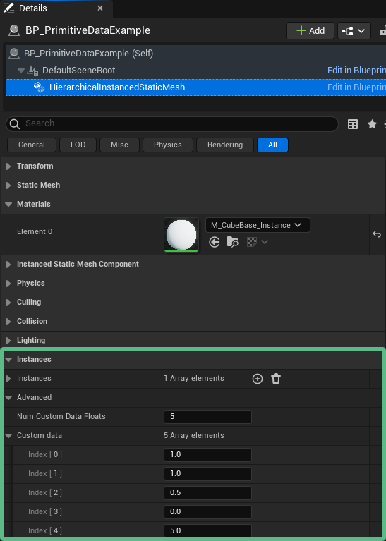 This is primarily due to the data being stored on the Primitive Object itself, such as a Static or Skeletal Mesh Component, instead of the material. In addition, this method increases performance by reducing the number of draw calls used for duplicate geometry within your scene.
