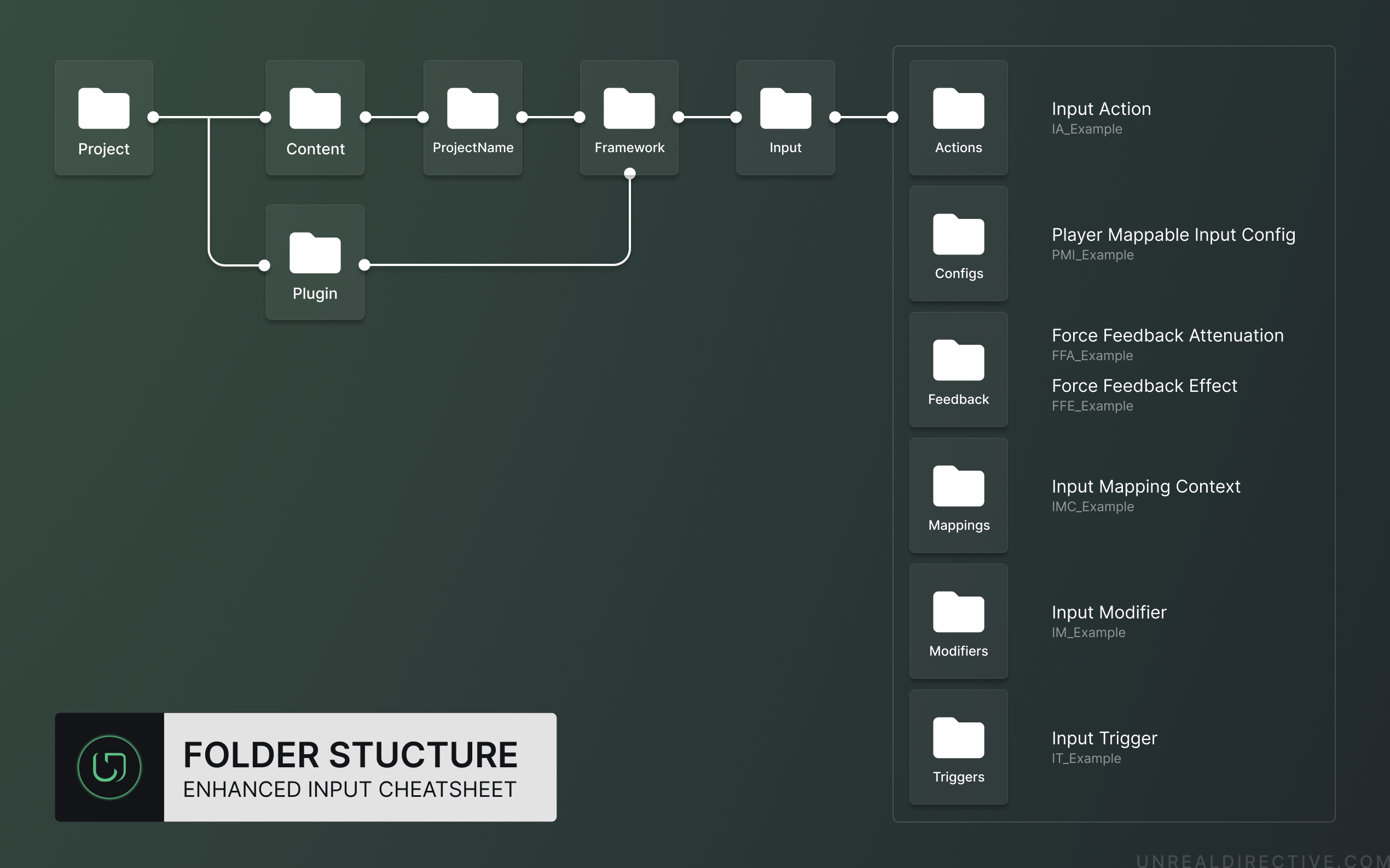 Enhanced Input assets should be placed in specific sub-directories under a parent Input directory. This Input directory should be under a Framework directory, which contains your games framework assets (e.g., Game Mode, Game State, Player Controller, etc.).