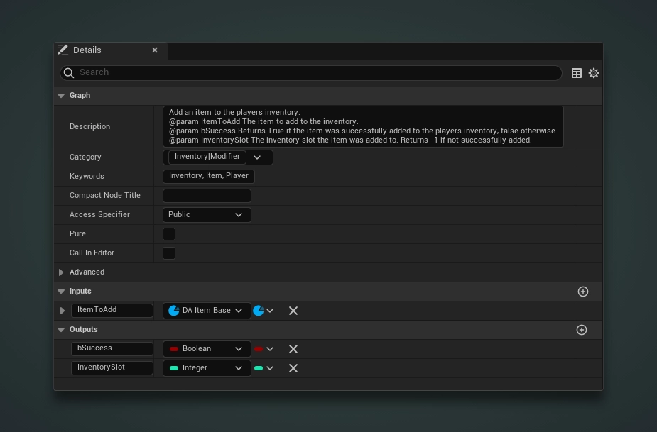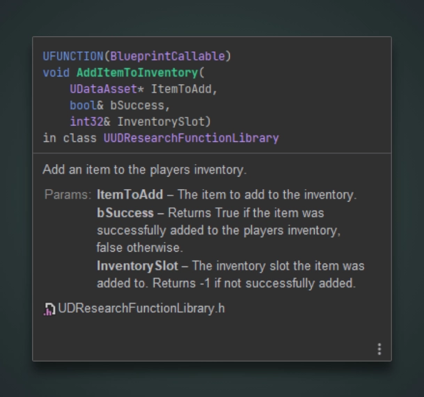 void AddItemToInventory(UItemBase* ItemToAdd, bool& bSuccess, int32& InventorySlot);Now, the above description of the function isn't very detailed. And that's exactly what a function without an accurate description will read. As a result, questions are left unanswered and have to be figured out or assumed.