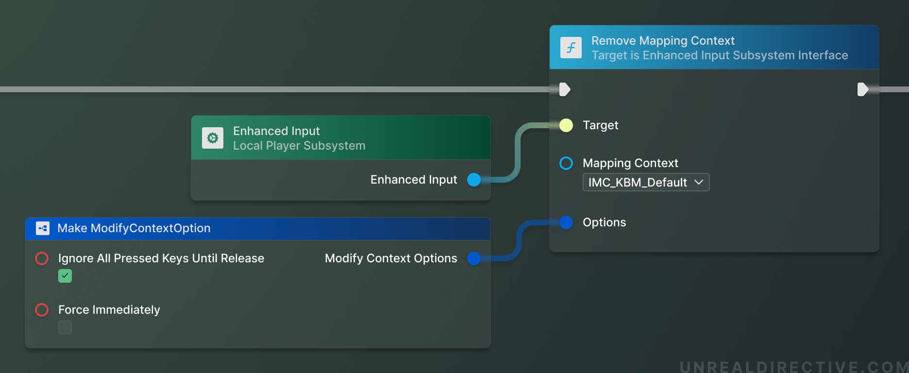 The Remove Mapping Context function will remove and deactivate a singular Input Mapping Context that has been registered with the players Enhanced Input Subsystem.