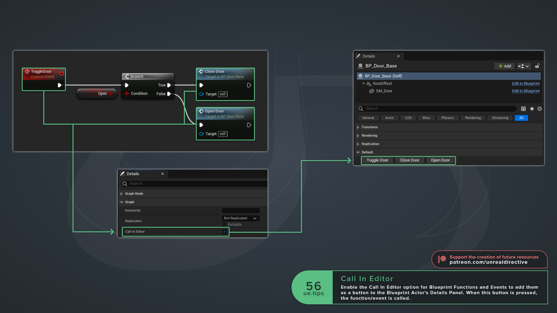 Enable the Call In Editor option for Blueprint Functions and Events to add them as a button to the Blueprint Actor's Details Panel. When this button is pressed, the function/event is called.