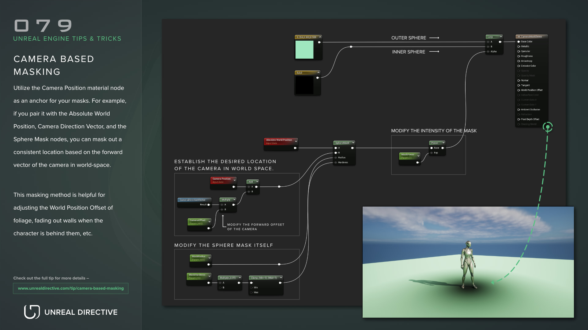 This masking method is helpful for adjusting the World Position Offset of foliage, fading out walls when the character is behind them, etc. Examples Here are a few examples that show this mask in use. Upload in progress...Your video file is being uploaded. The currently loaded video is the source file. Upload in progress...Your video file is being uploaded. The currently loaded video is the source file.