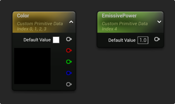 This is primarily due to the data being stored on the Primitive Object itself, such as a Static or Skeletal Mesh Component, instead of the material. In addition, this method increases performance by reducing the number of draw calls used for duplicate geometry within your scene.