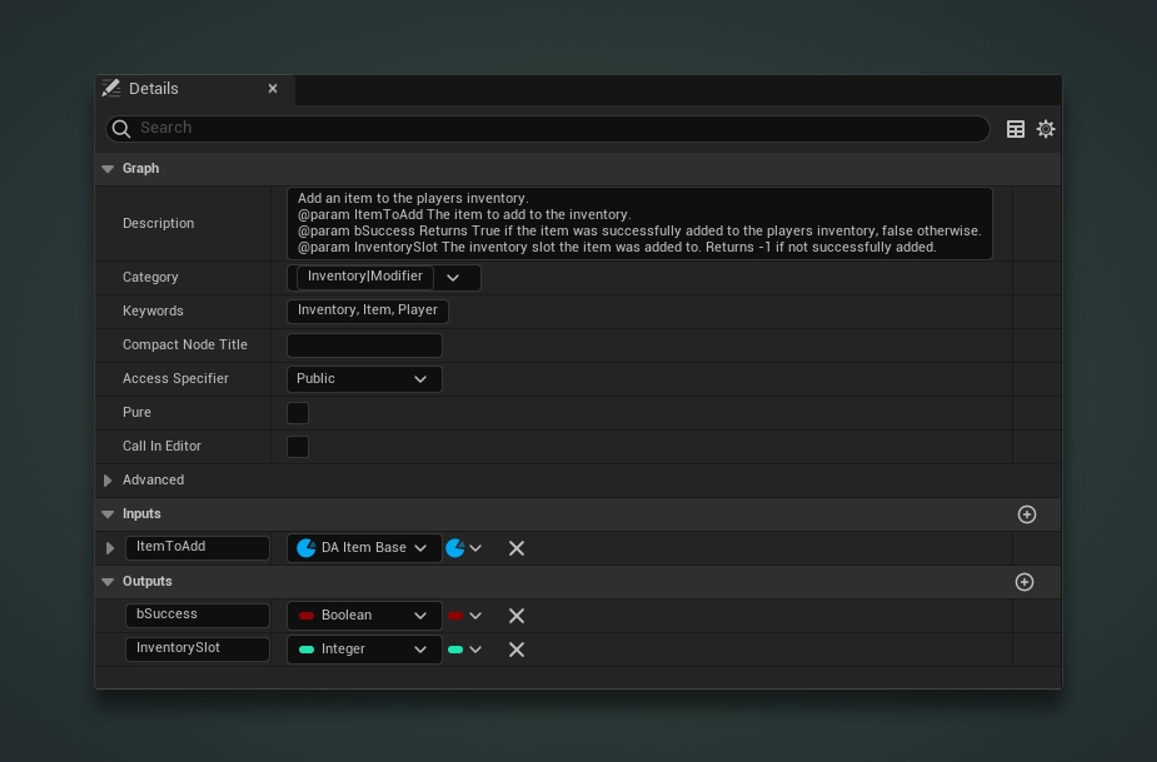 bool AddItemToInventory(UItemBase* ItemToAdd);This blueprint example will be a 1-to-1 replication of the C++ function. It will accept a custom UDataAsset "ItemToAdd" as an input and will output two parameters -- a boolean "bSuccess" and an int32 "InventorySlot".