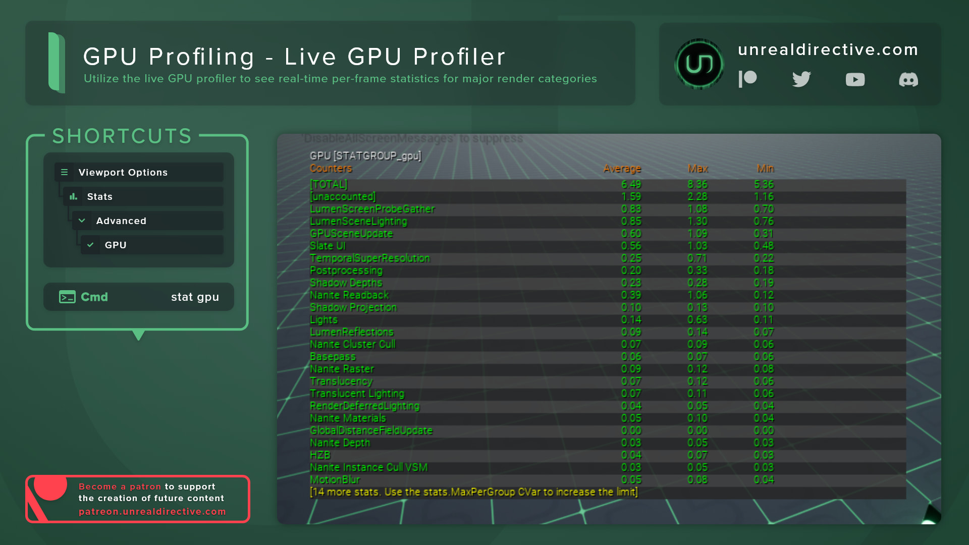 Utilize the live GPU profiler to see real-time per-frame statistics for major render categories.
