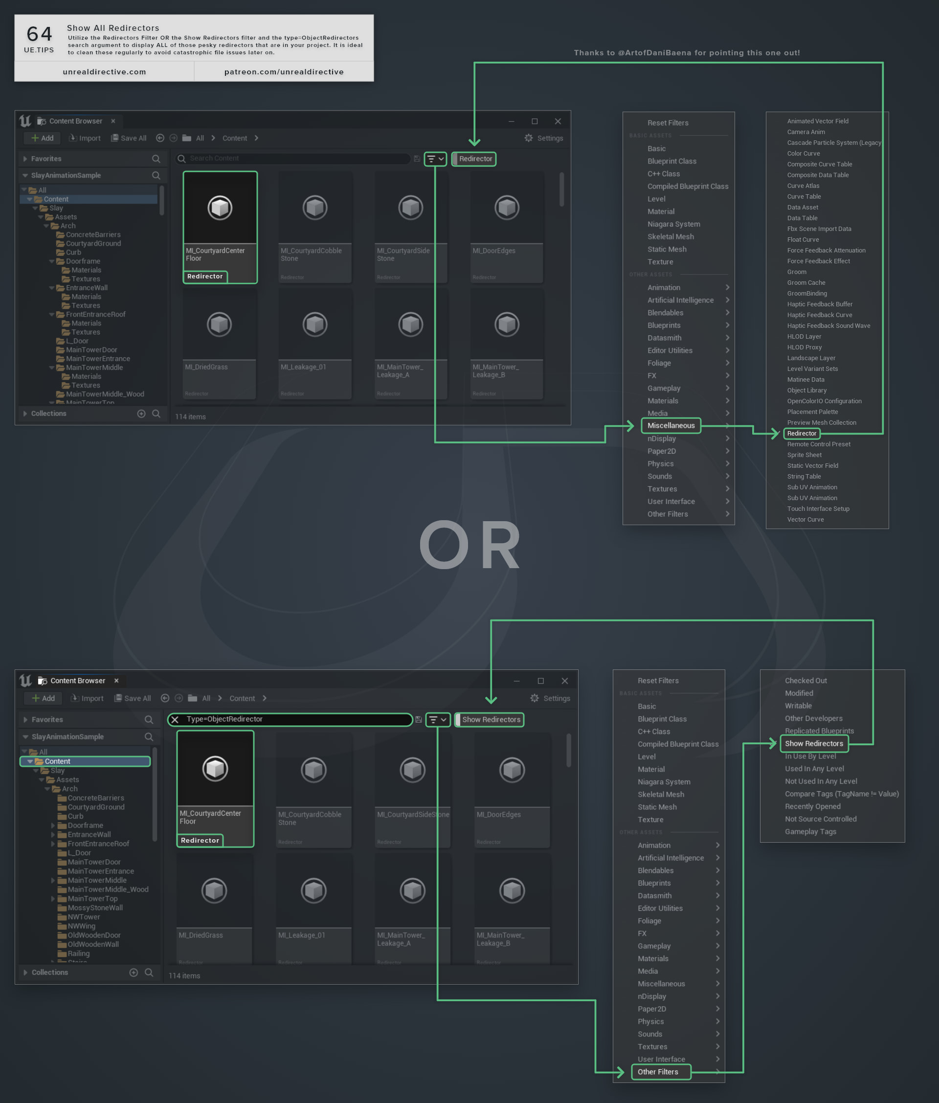 Utilize the Redirectors Filter OR the Show Redirectors filter and the type=ObjectRedirectors search argument to display ALL of those pesky redirectors that are in your project.