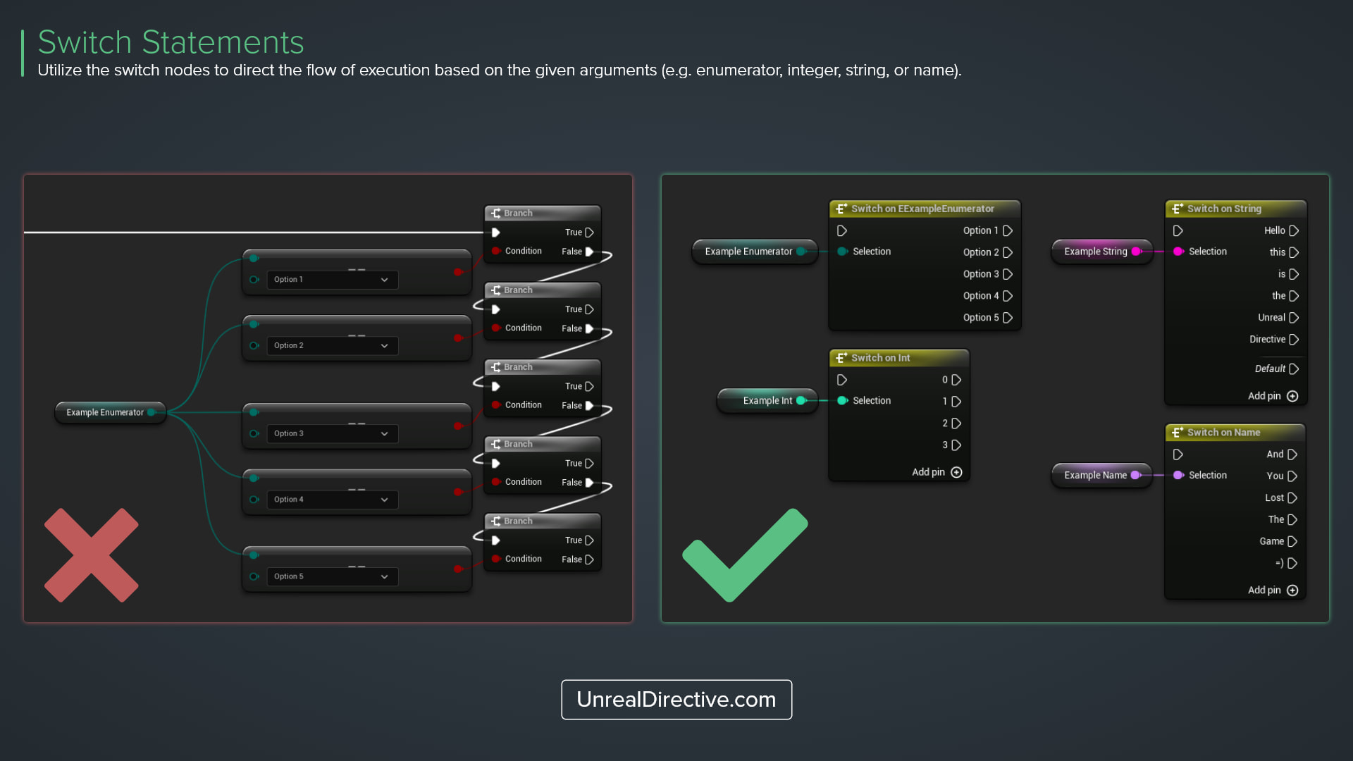 Utilize the switch nodes to direct the flow of execution based on the given arguments (e.g. enumerator, integer, string, or name).