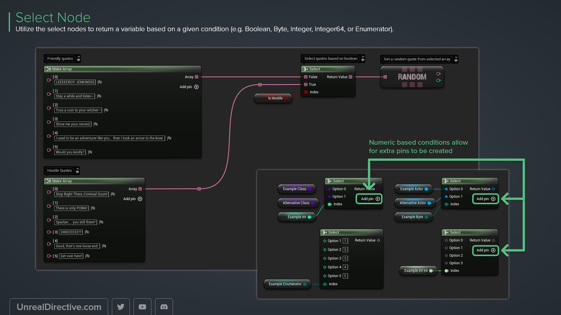 Utilize the select nodes to return a variable based on a given condition (e.g. Boolean, Byte, Integer, Integer64, or Enumerator).